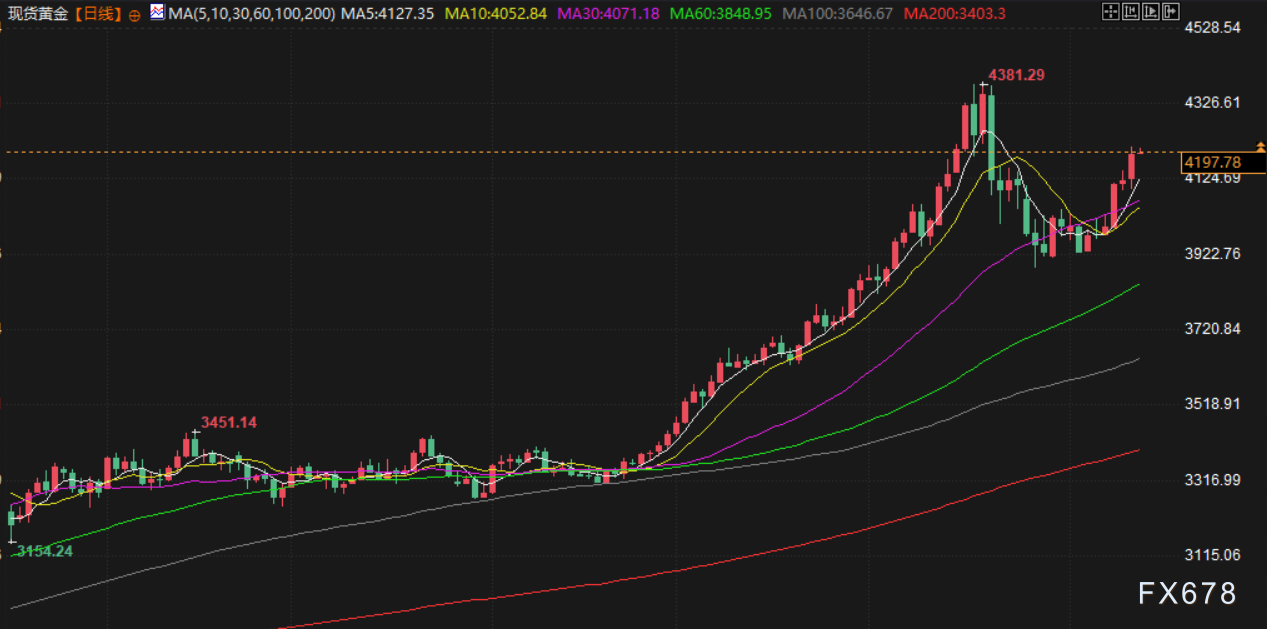 汇通财经APP讯——周四(北京时间11月13日)亚市早盘,现货黄金交投于4195美元/盎司附近,金价周四强势上涨,现