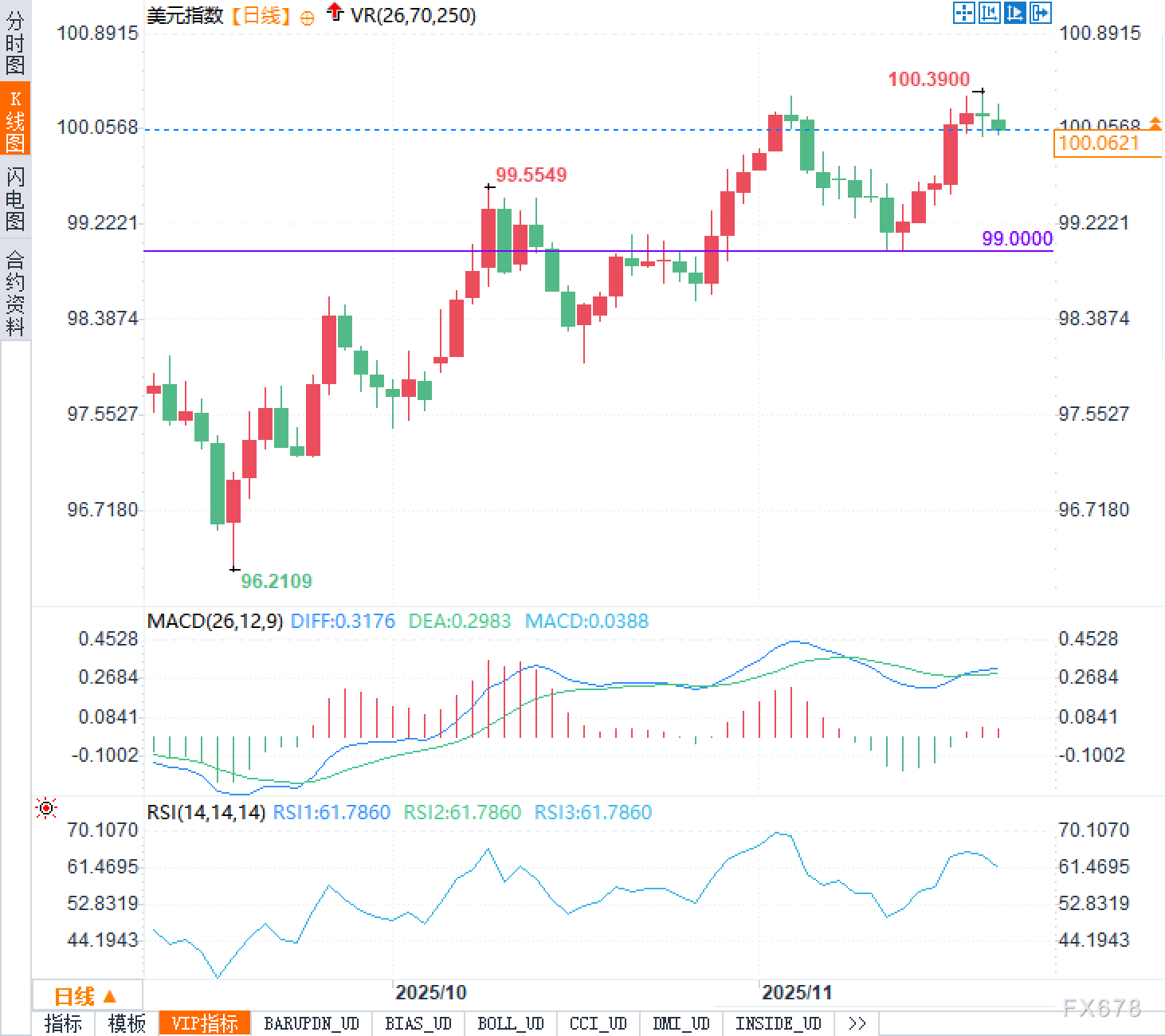 RSI在60一线震荡,前期曾接近70后回落,反映多头力量占优但短线情绪趋于理性。价格在整数位100附近来回拉锯,上方关注前高100.39一带的压力,下方则以99.00附近的密集成交区作为重要支撑,一旦在该区间形成放量突破或跌破,才可能指引下一阶段的趋势方向。