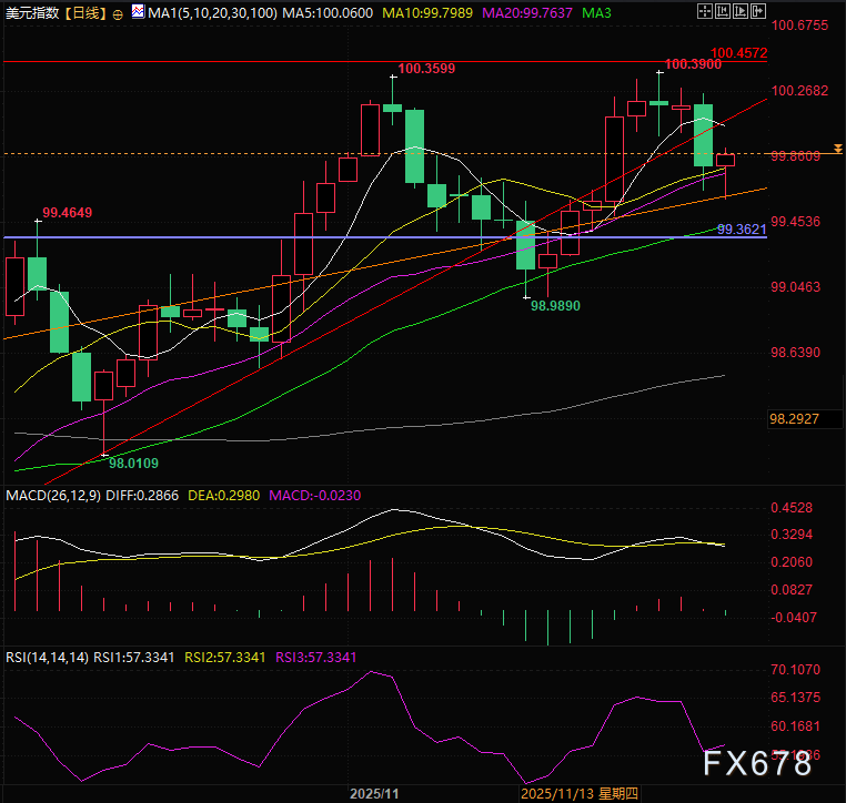 汇通财经APP讯——周三(11月26日)亚欧交易时段,美元指数走出多次探底回升的宽幅震荡走势,目前交投于99.79附近,受数据影响交易员对美国12月降息预期的持续升温推动美元早盘继续探底,同时俄乌和平协议签署协议延后的消息以及空头头寸增仓过猛后多头的回补又提振了美元指数,最后在英国超预期财政预案和美国数据影响下继续宽幅震荡。
