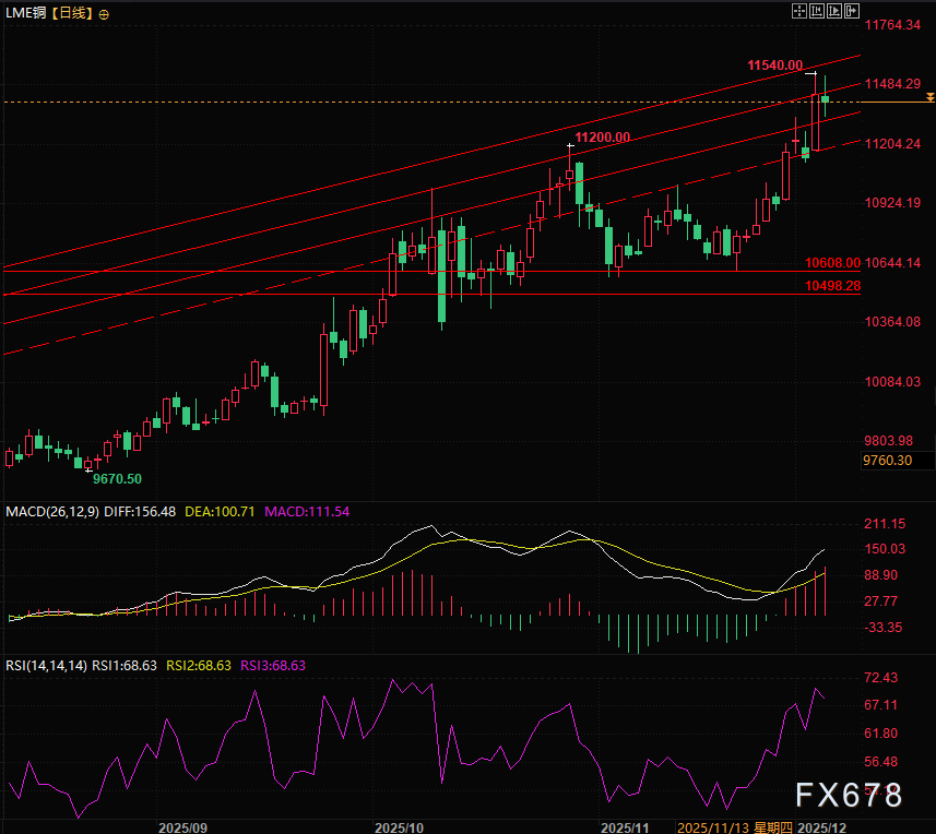 汇通财经APP讯——周四(12月4日)亚欧时段LME铜价冲高回落,铜价尝试挑战周三创出的历史新高11540,最终最高打到11529美元/吨。