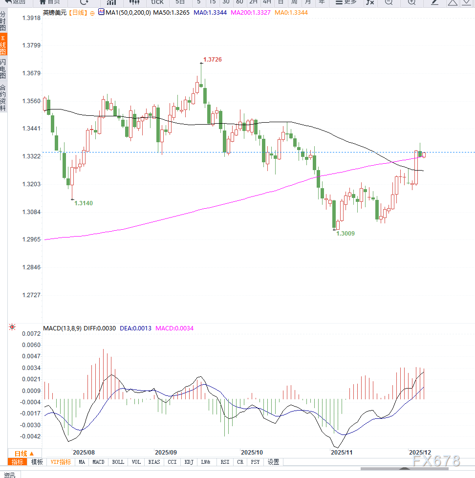 汇价现报1.3328,稳守 100日指数均线(1.3300) 之上,均线平缓后支撑汇价上行。